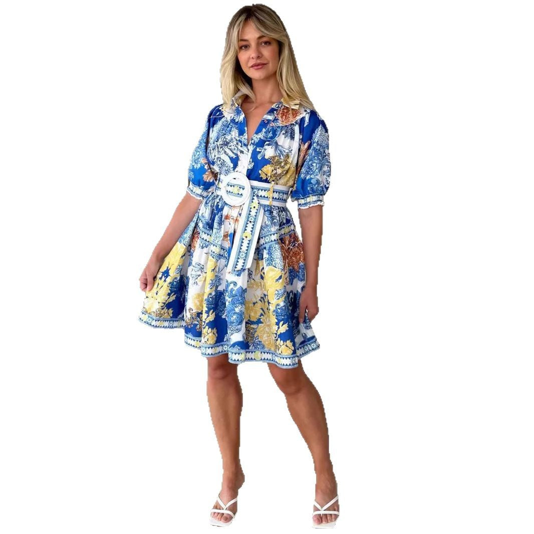 - Design: A-line silhouette, V-neck, puff sleeves, waist belt, print