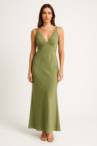 Women's evening dress – Satin look – Slim fit – Sleeveless – V-neck with lace trim