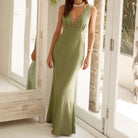 Discover the elegant Women's evening dress – Satin-look – Slim fit – Sleeveless – V-neck with lace trim. This luxurious evening dress accentuates your figure with a stylish slim fit and a beautiful satin look. Perfect for formal occasions, with a refined V-neck and delicate lace trim for an unforgettable appearance.