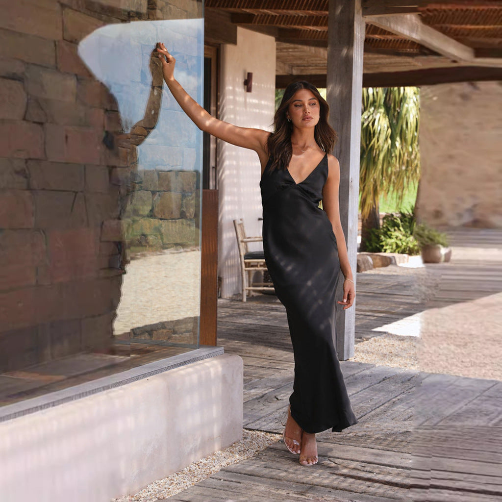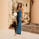 Ladies Evening Dress – Satin Look – V-neck – Sleeveless – Open Back – Split – Maxi Length