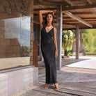 • Design: V-neck, sleeveless, open back, split, maxi length, tailored fit