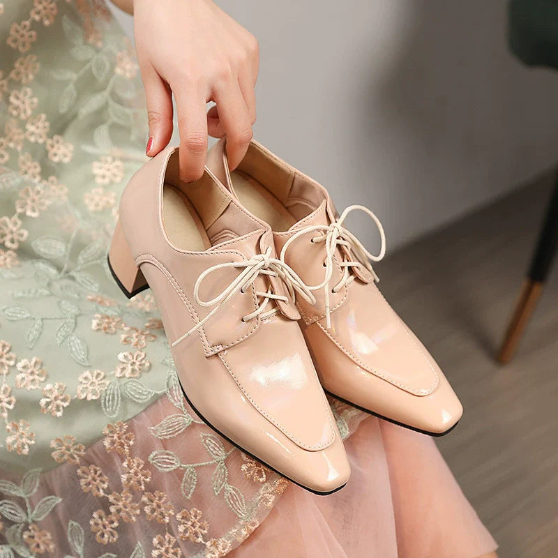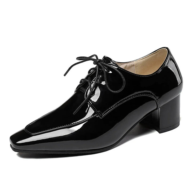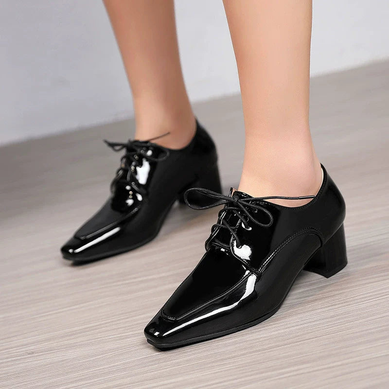 - Design: Modern, pointed square toe, block heel, lace-up closure, glossy finish