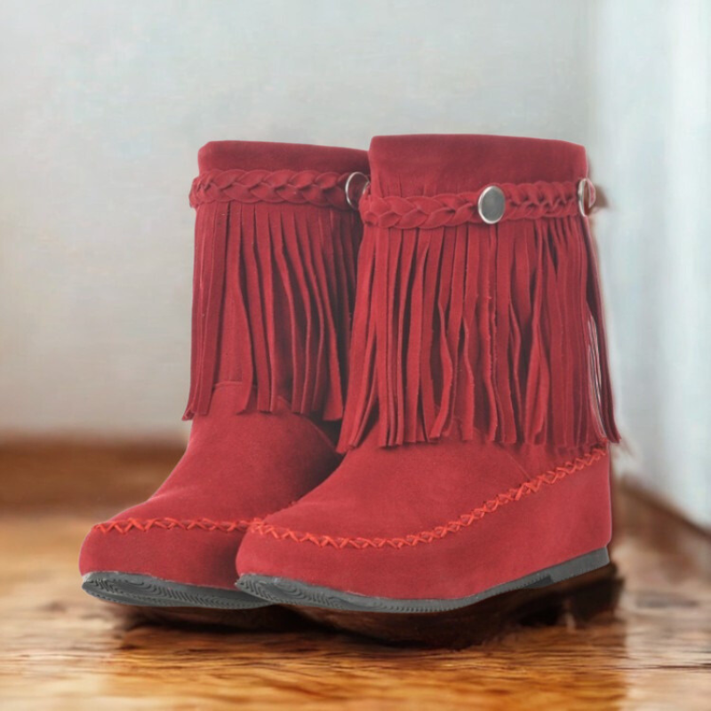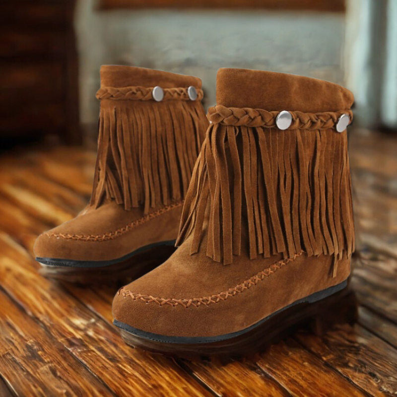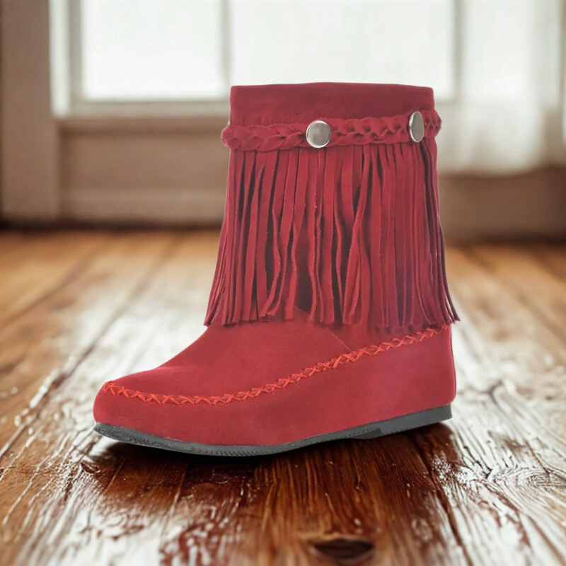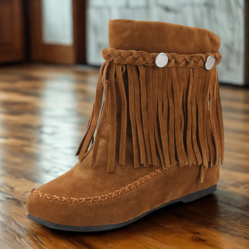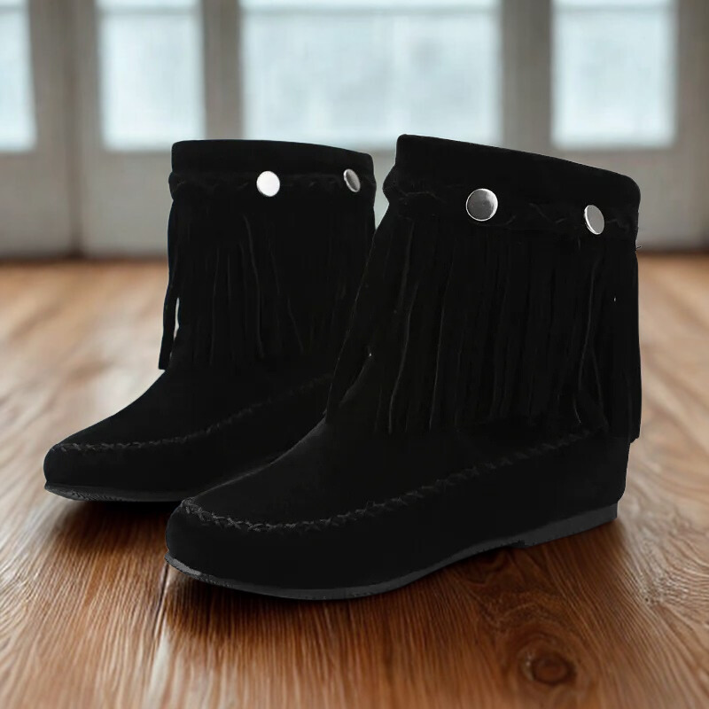 Ladies Ankle Boots – SuedeLook – Fringe Boho Style – Flat Sole – MocToe Stitching