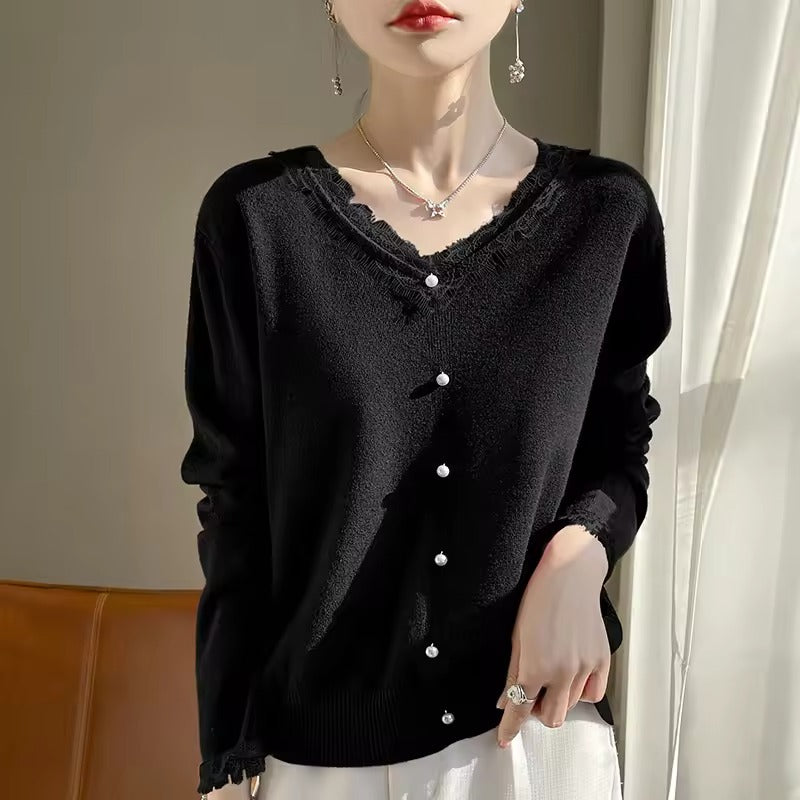 - Design: Relaxed fit, V-neck with delicate lace, long sleeves, subtle button details, frayed edges.