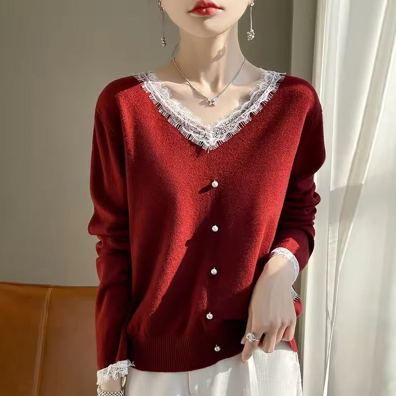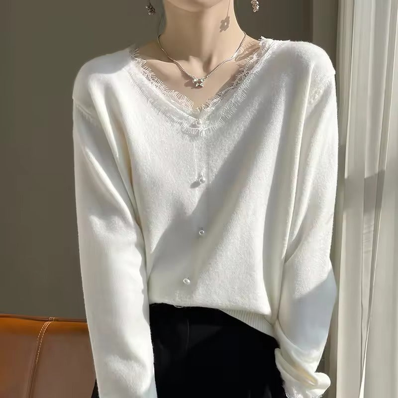 Women's Knitted Sweater – Wool Mix – Relaxed Fit – V-neck with Lace – Long Sleeves