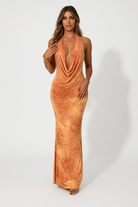 Women's Halter Dress – Satin Look – Slim Fit – Backless – Cowl Neck – Floral Print – Ankle Length