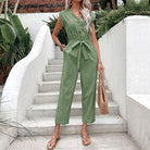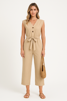 Women's Jumpsuit – V-neck – Sleeveless – Relaxed Fit – Button Closure – Waist Tie