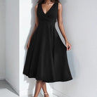- Design: Fitted A-line silhouette, V-neck, sleeveless, midi length, streamlined appearance