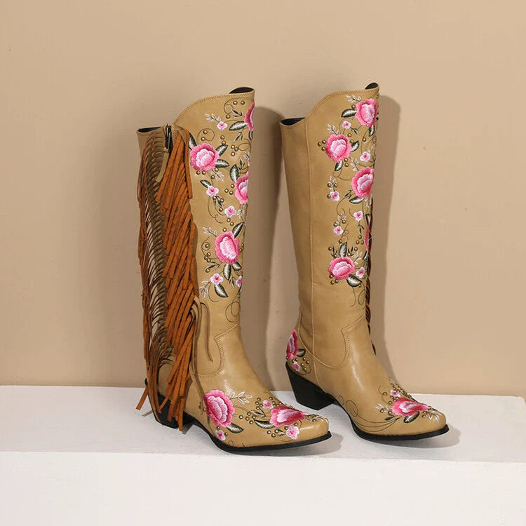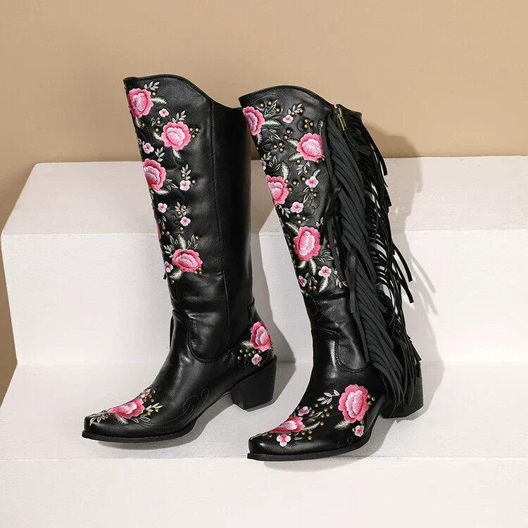 Ladies Knee-High Boots – Embroidered Flowers – Studs – Fringe – Block Heel