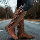 Ladies Knee-High Boots – Faux Leather – Criss-Cross Lacing – Low Block Heel – Side Zip