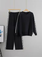 - Design: Relaxed crewneck top with long sleeves and matching wide-leg pants. Features decorative side stripes.