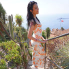 - Design: Fitted silhouette, spaghetti straps, cowl neck, floral print, lace-up closure