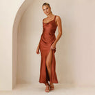 Women's Long Dress – Satin Look – Slim Fit – Cowl Neck – Slit – Formal Occasion
