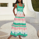Women's Maxi Dress – A-line Fit – Cotton – Sleeveless – Tiered Layer with Print – Pockets