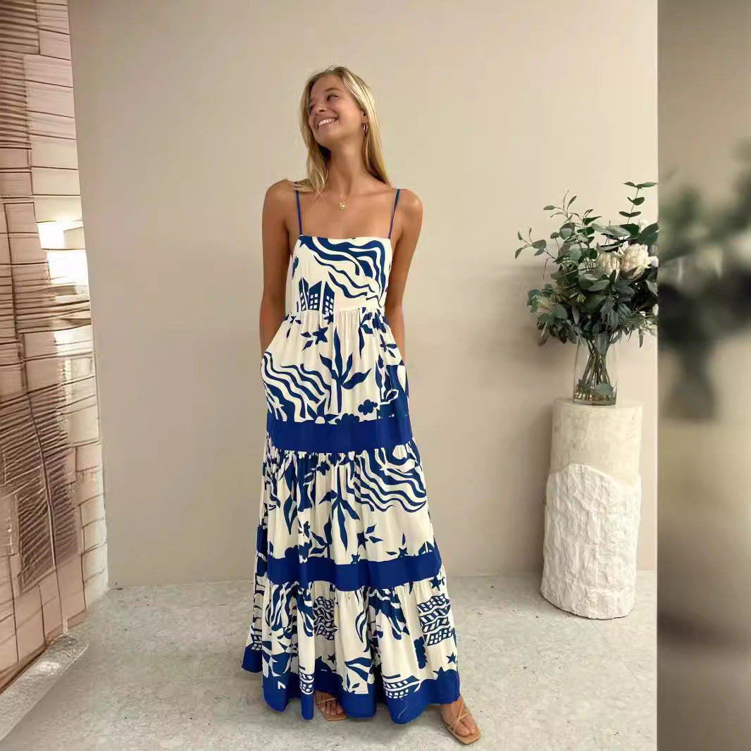 Women's maxi dress – Flow A-line fit – Spaghetti straps – Layered design – Cotton blend