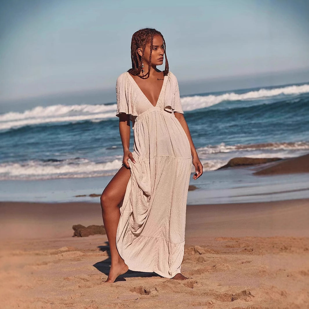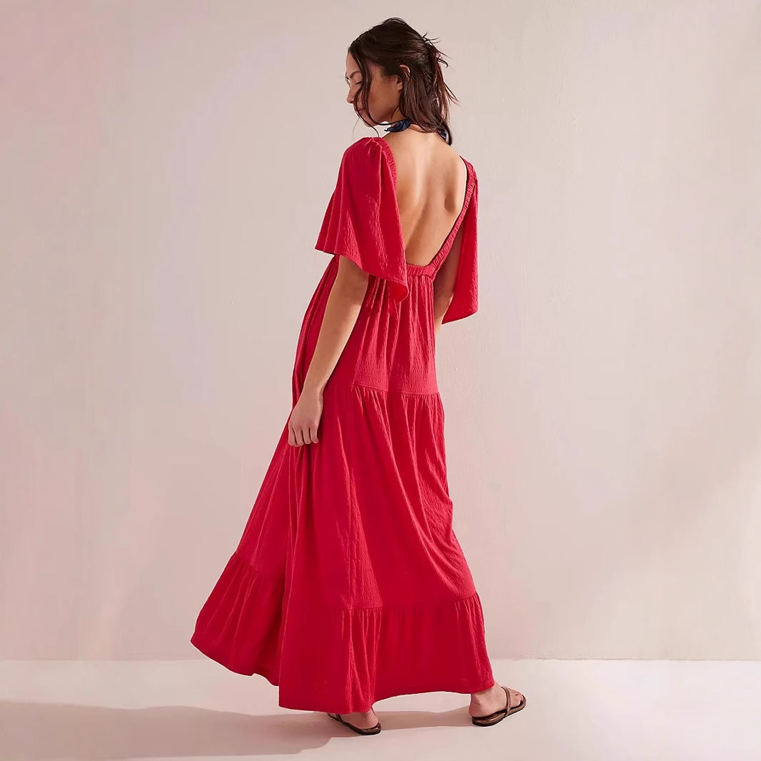 Women's Maxi Dress – Loose-Fitting Model – V-Neck – Open Back – Light Fabric – Split