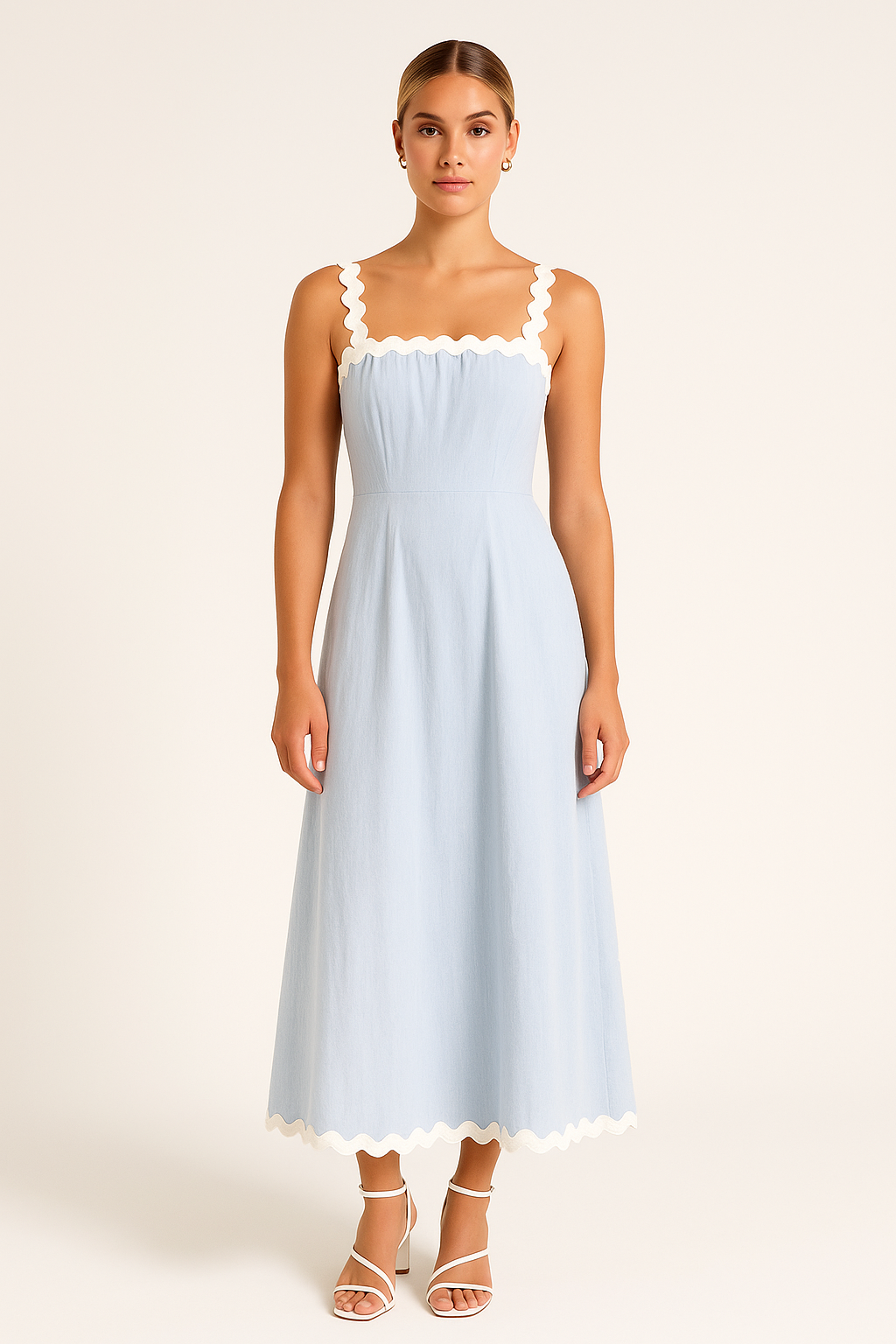 Discover the Women's Maxi Dress – Slim Fit – Cotton – Spaghetti Straps – Scallop Finish. This comfortable, breathable cotton dress with an elegant slim fit and delicate spaghetti straps is perfect for summer days. The refined scallop finish adds a unique, feminine touch to this stylish, full-length women's dress.