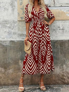 - Design: A-line fit, V-neck wrap, geometric print, belt, puff sleeves