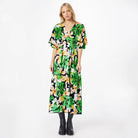 Ladies Midi Dress – High Waist – Allover Print – V-neck – Slit – Wide Sleeves