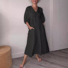 Discover the Women's Midi Dress – Linen Cotton – Relaxed Fit – V-Neck – Pockets – Cuffed Sleeves by Jules Jij. This breathable linen-cotton blend dress offers ultimate comfort with a loose fit, deep V-neck, handy pockets and stylish cuffed sleeves. Perfect for a casual chic look.
