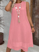 - Design: Loose-fitting, sleeveless, round neck, subtle layered hem