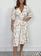 Women's midi-dress – Loose fit – High waist – Botanical print – V-neck – Ruffled sleeves