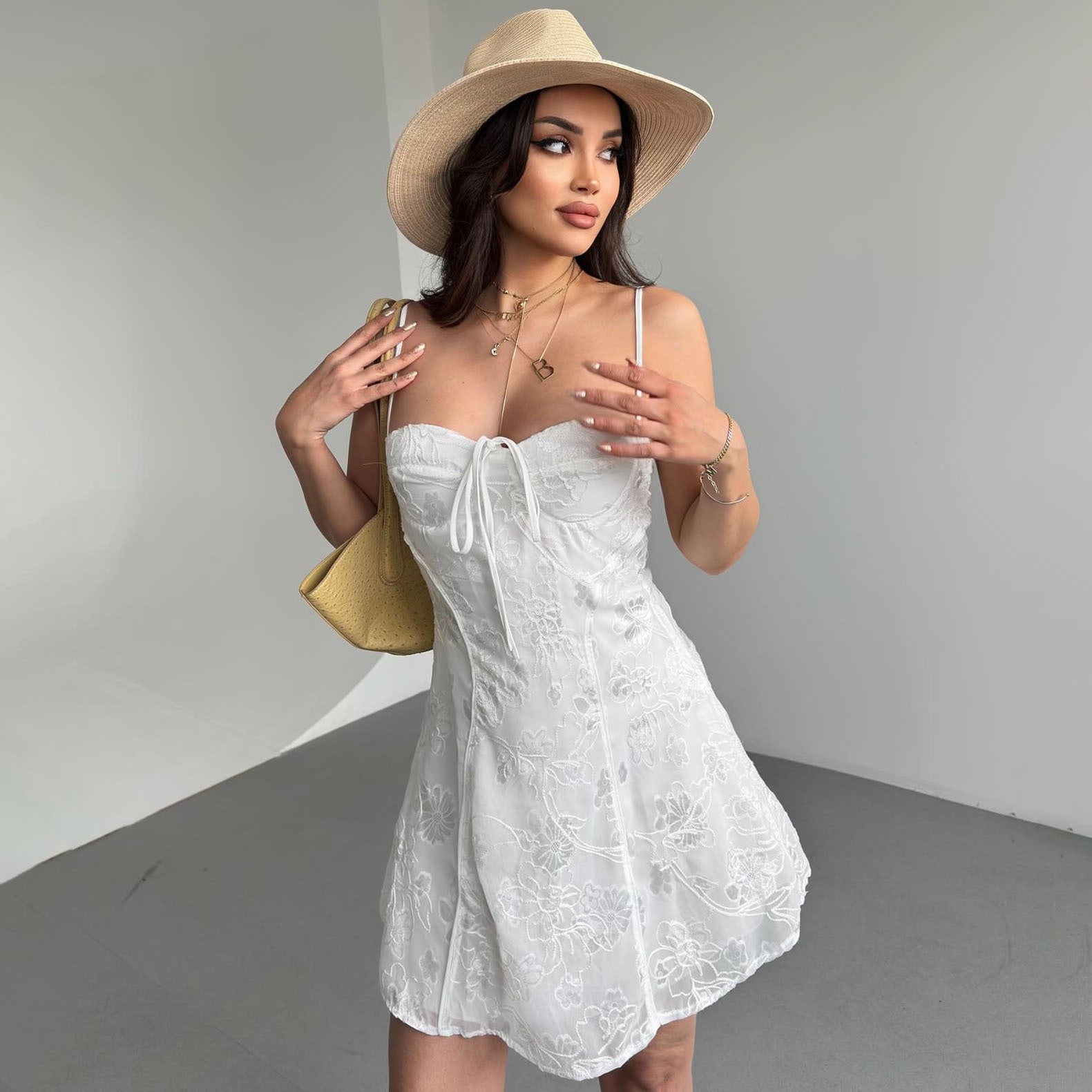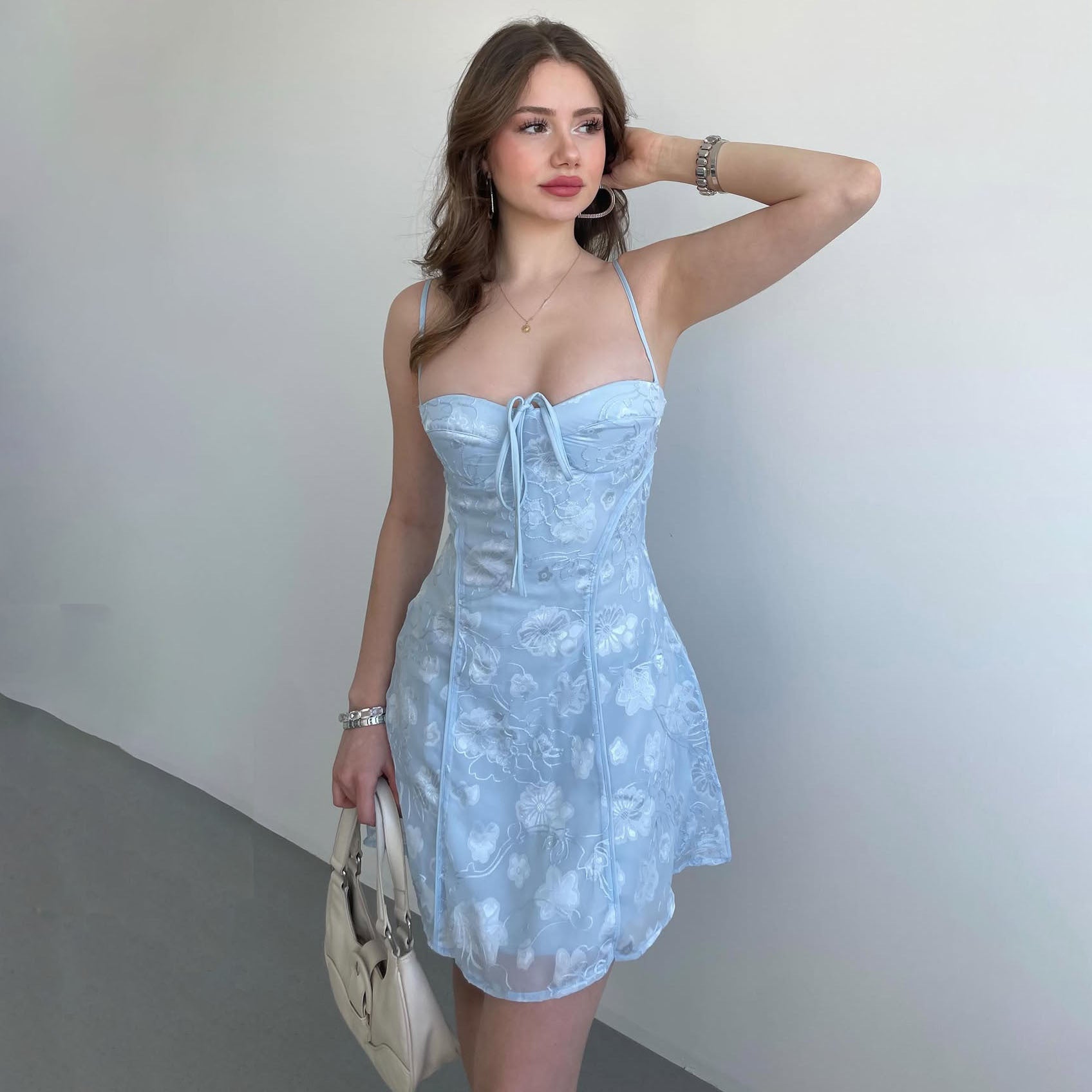 Women's mini dress – Figure-hugging model – Lace – Spaghetti straps – Floral pattern