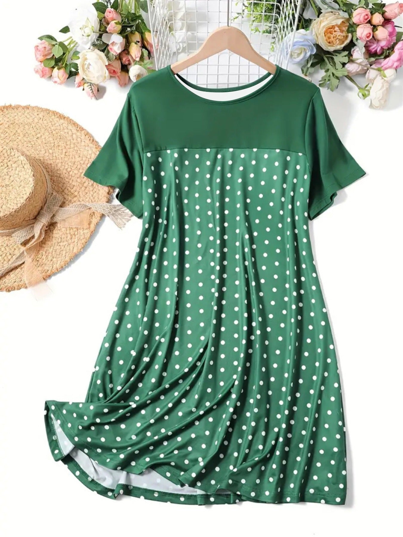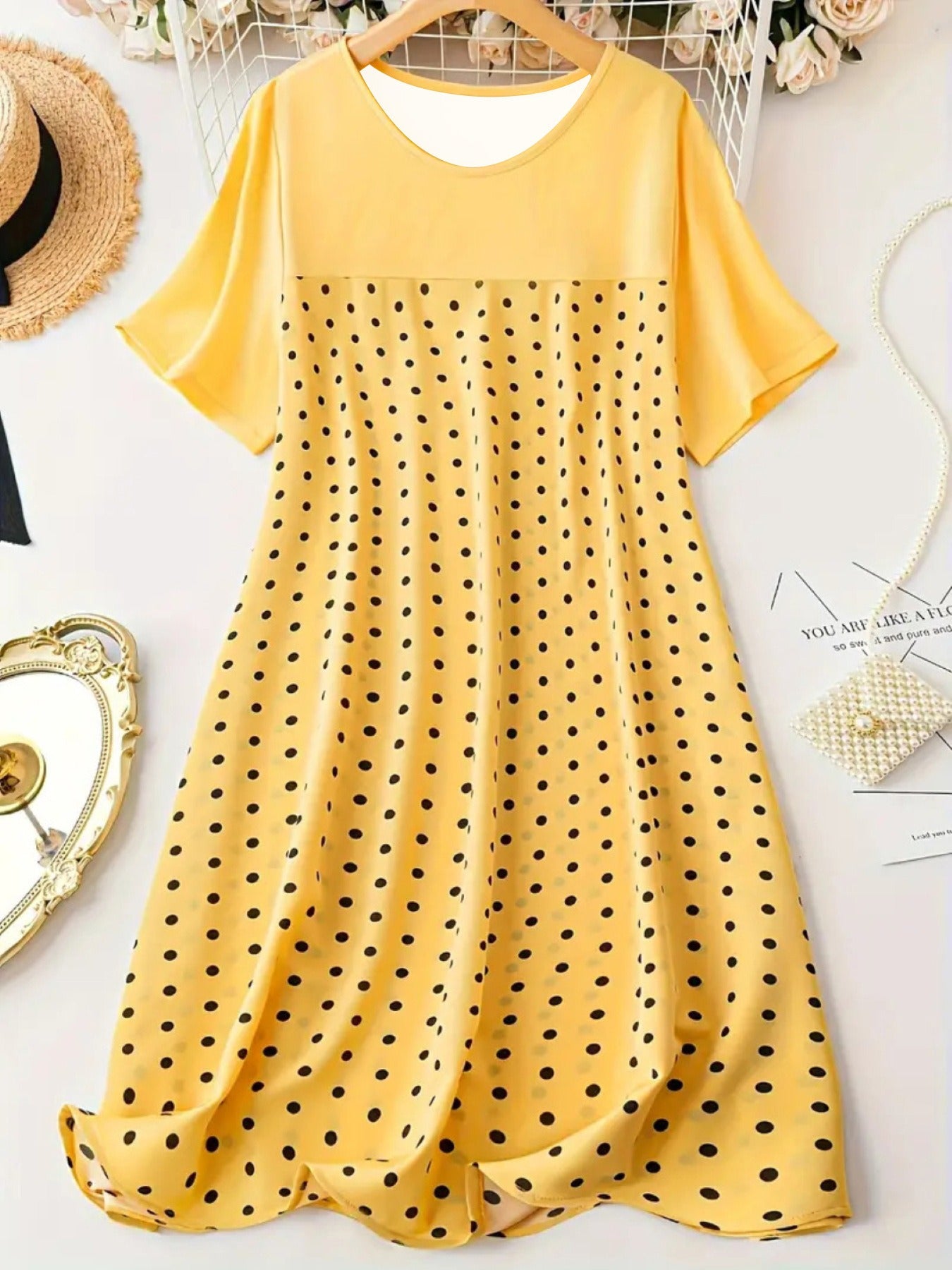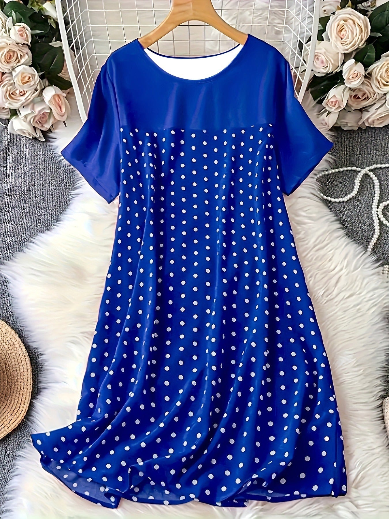 - Design: Loose fit, polka dot print, short sleeve, round neck, midi length