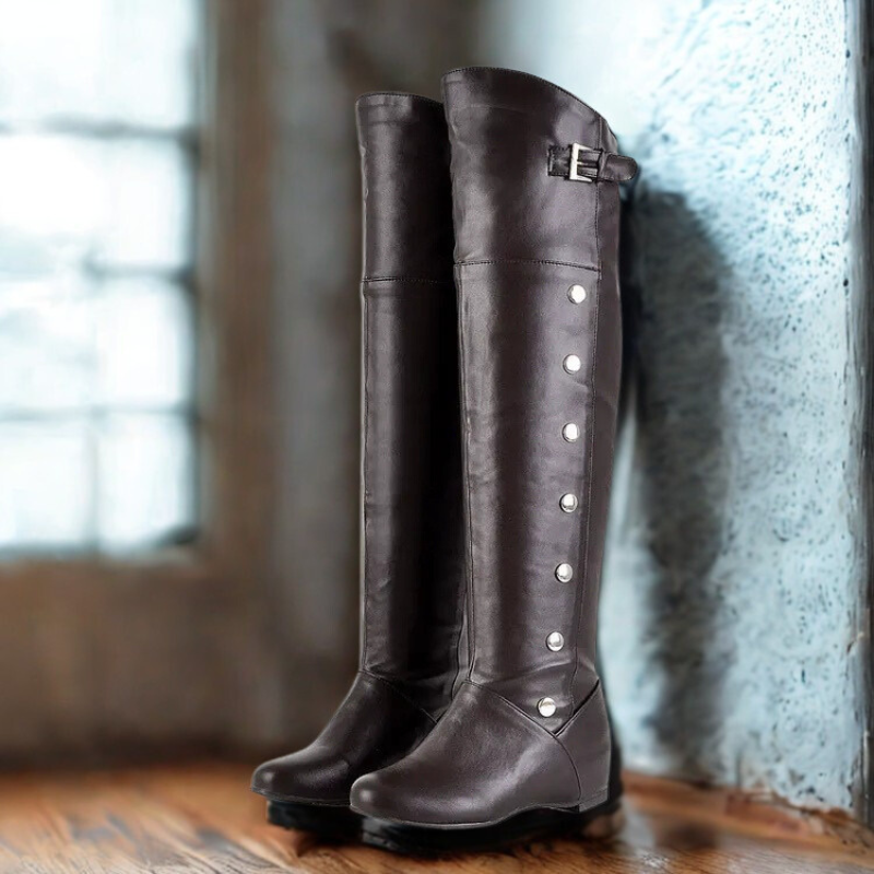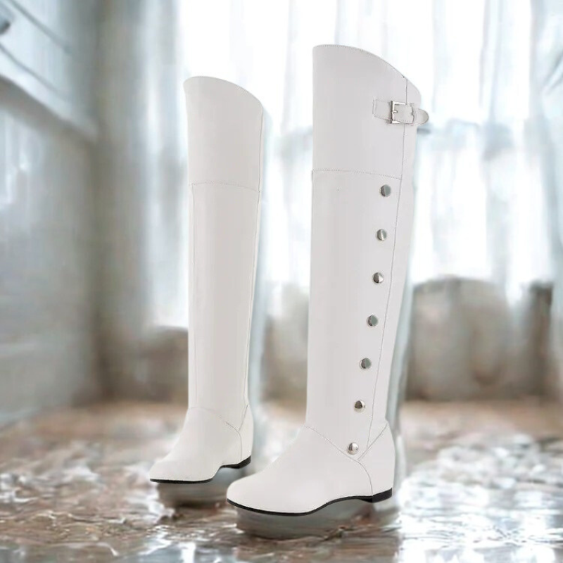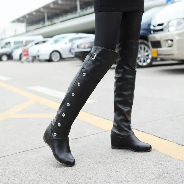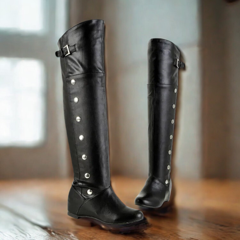 Women's Overknee Boots – Slim Fit – Flat Heel – Buckle – Studs – Slip-On Model