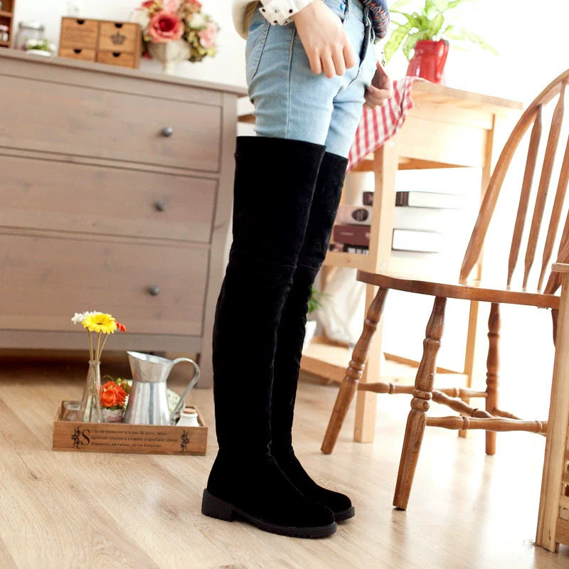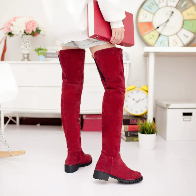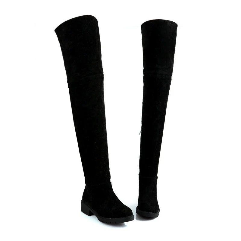 Women's Overknee Boots – Suede Look – Low Block Heel – Tread Sole – Slim Fit