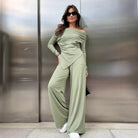 Ladies Set – Knitted Off-Shoulder Top with Asymmetrical Hem and Wide-Leg Pants