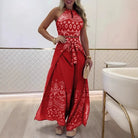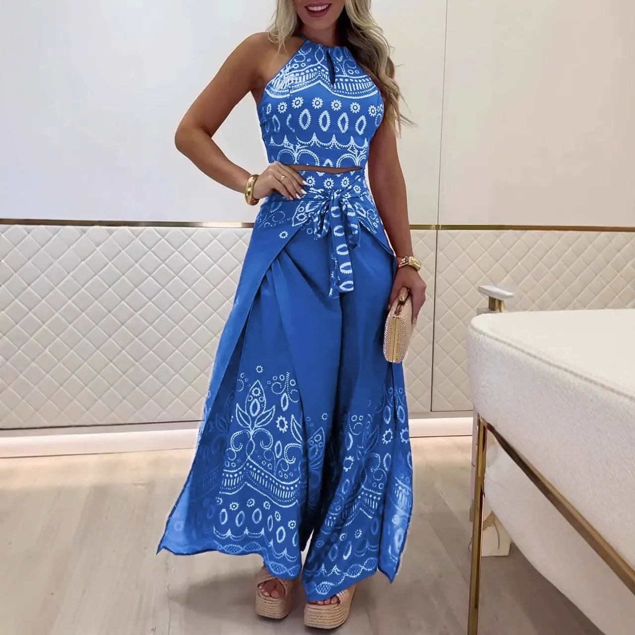 - Design: Halter top with keyhole detail, wide pants with tie belt, retro print, cropped fit.