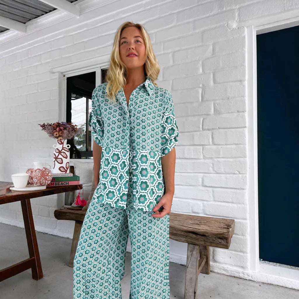 Ladies set with blouse and trousers – Relaxed fit – Cotton – Geometric print – Short sleeve