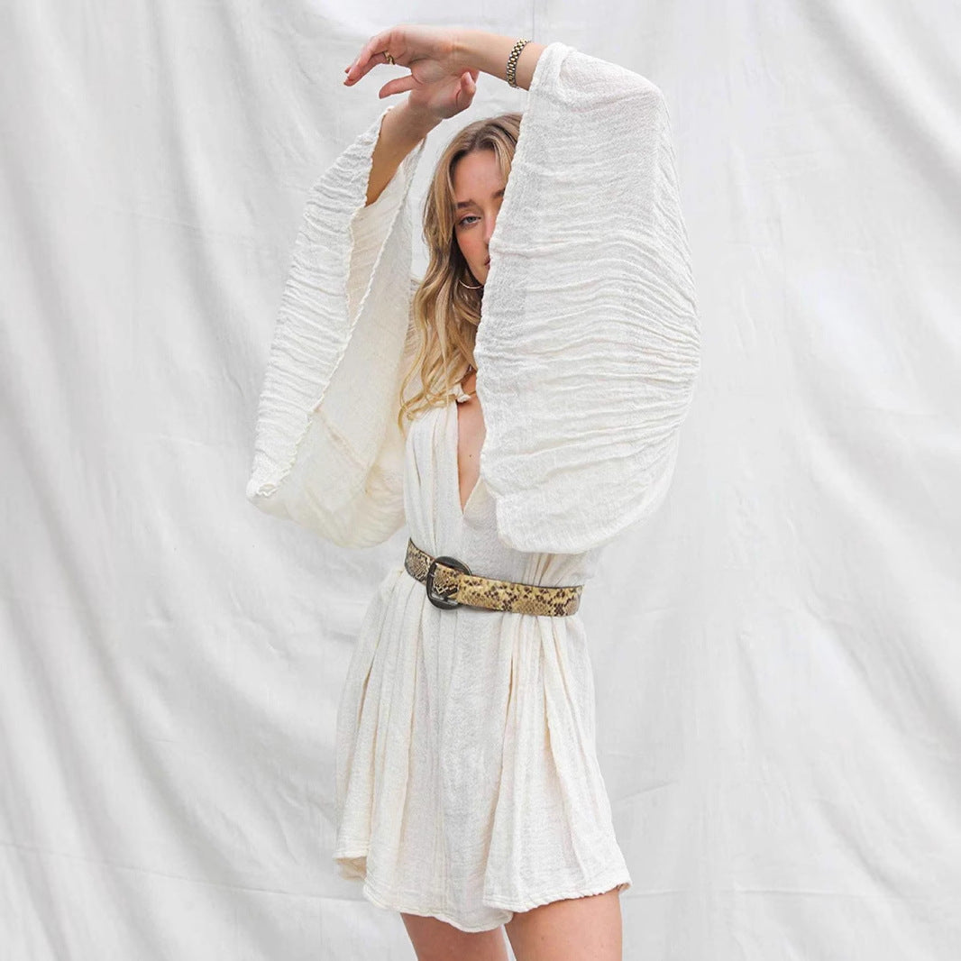 Women's Beach Dress – Cotton – Loose-Fitting Model – V-Neck – Mini – 3/4 Sleeve – With Belt