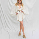- Design: Loose fit, V-neck, 3/4 sleeve, mini length, with belt