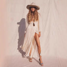Discover the Women's Beach Dress – Cotton – Wrap design – Long Sleeves – High Split – V-neck. This airy cotton dress with an elegant V-neck, long sleeves and a high split offers ultimate comfort and style for any beach day. Perfect as a fashionable beach cover-up.