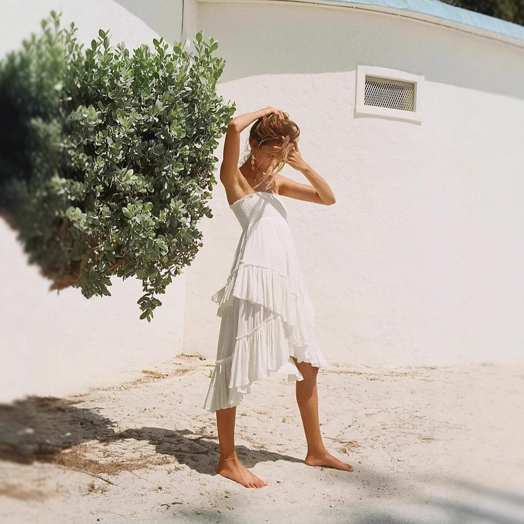 Ladies Strapless Dress – Flowy Fit – Layered Ruffles – Lightweight Cotton Look
