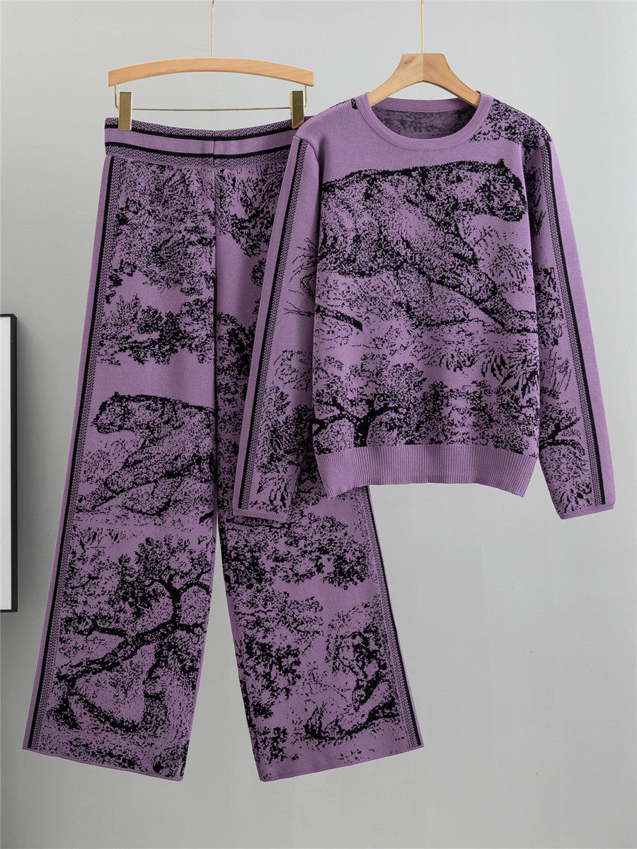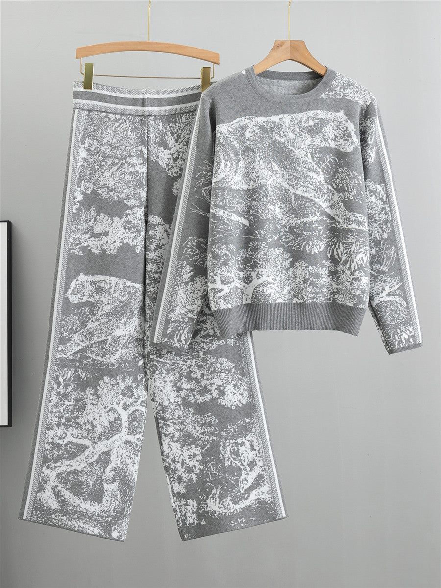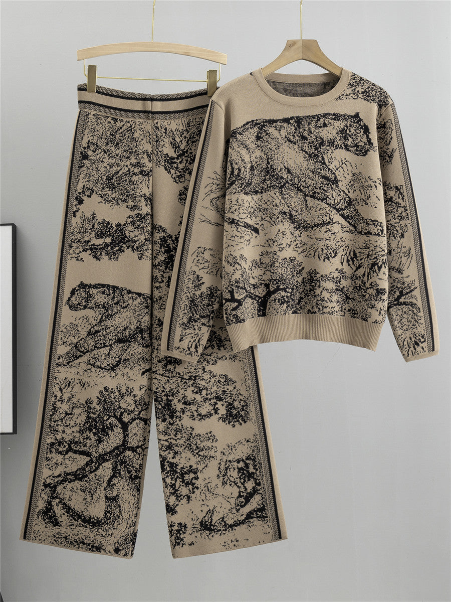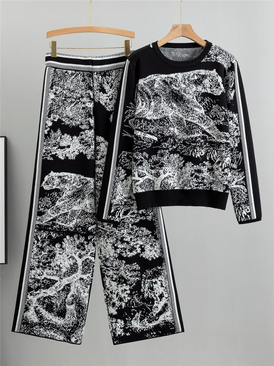 Ladies Two-Piece Set – Jacquard Knit – Relaxed Fit – High Waist Wide Legs