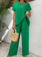 Women's Two-Piece Set – Relaxed Fit – Pleated Fabric – Short Sleeves – Wide Legs