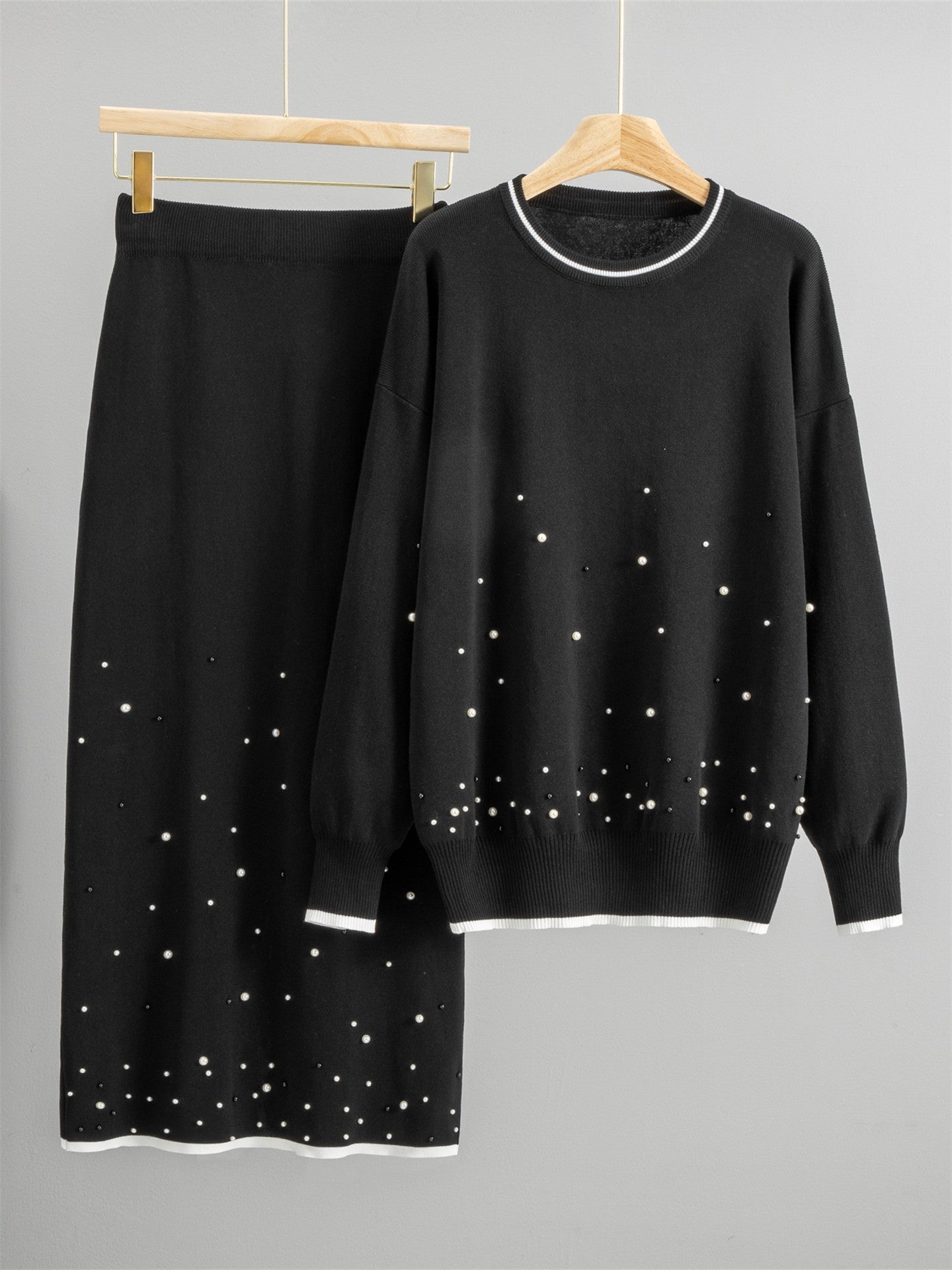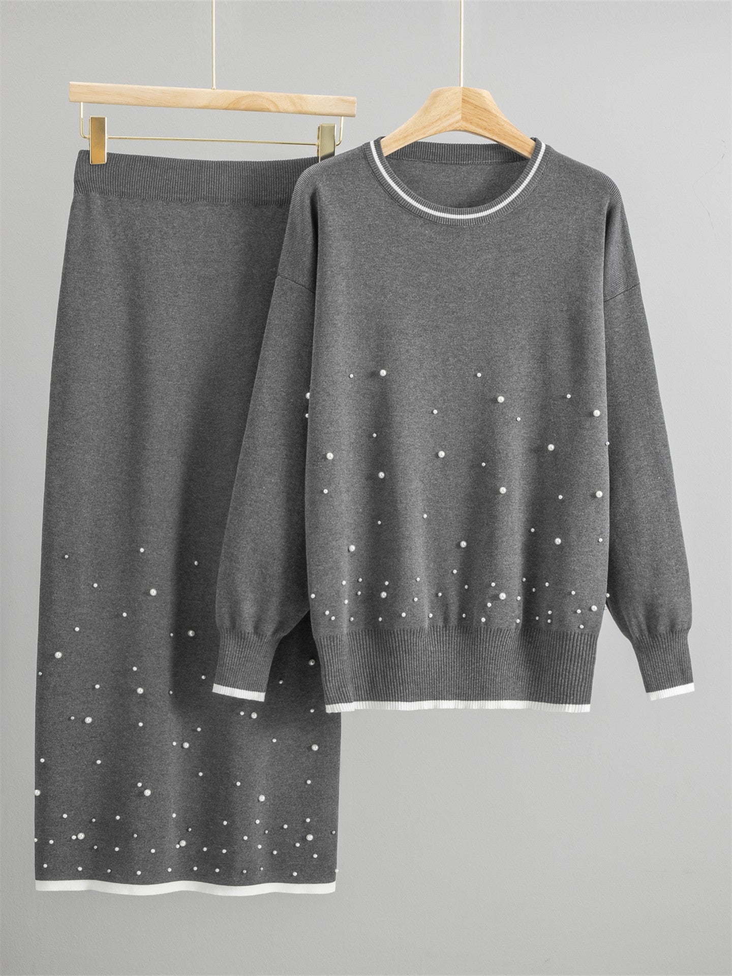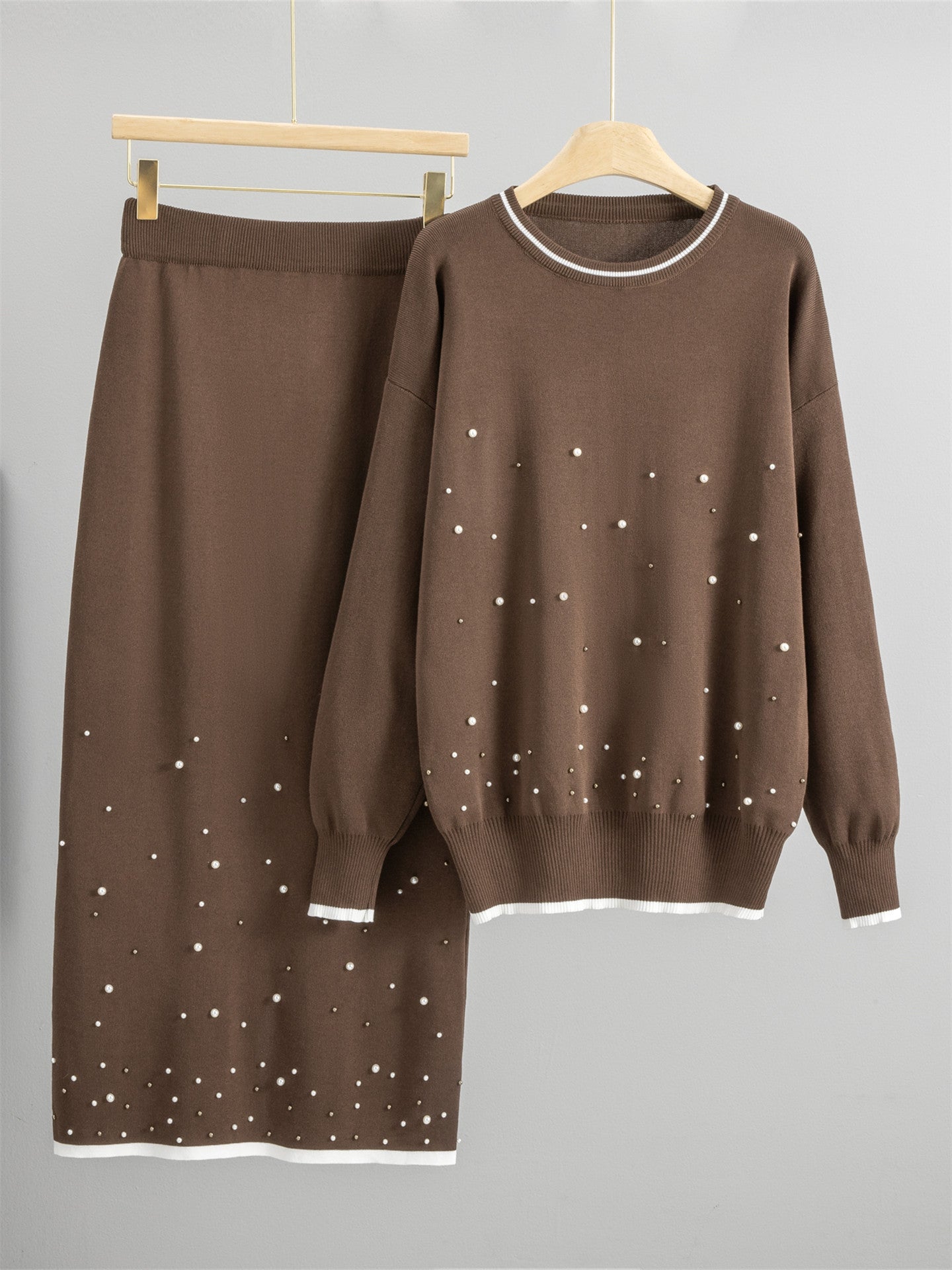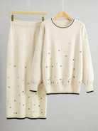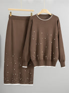 Ladies Two-Piece Knitted Set – Loose-Fitting Top – Slim Fit Midi Skirt – Beaded Detail