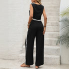 - Design: Sleeveless croptop with relaxed fit & long pants with wide legs and contrasting trims.