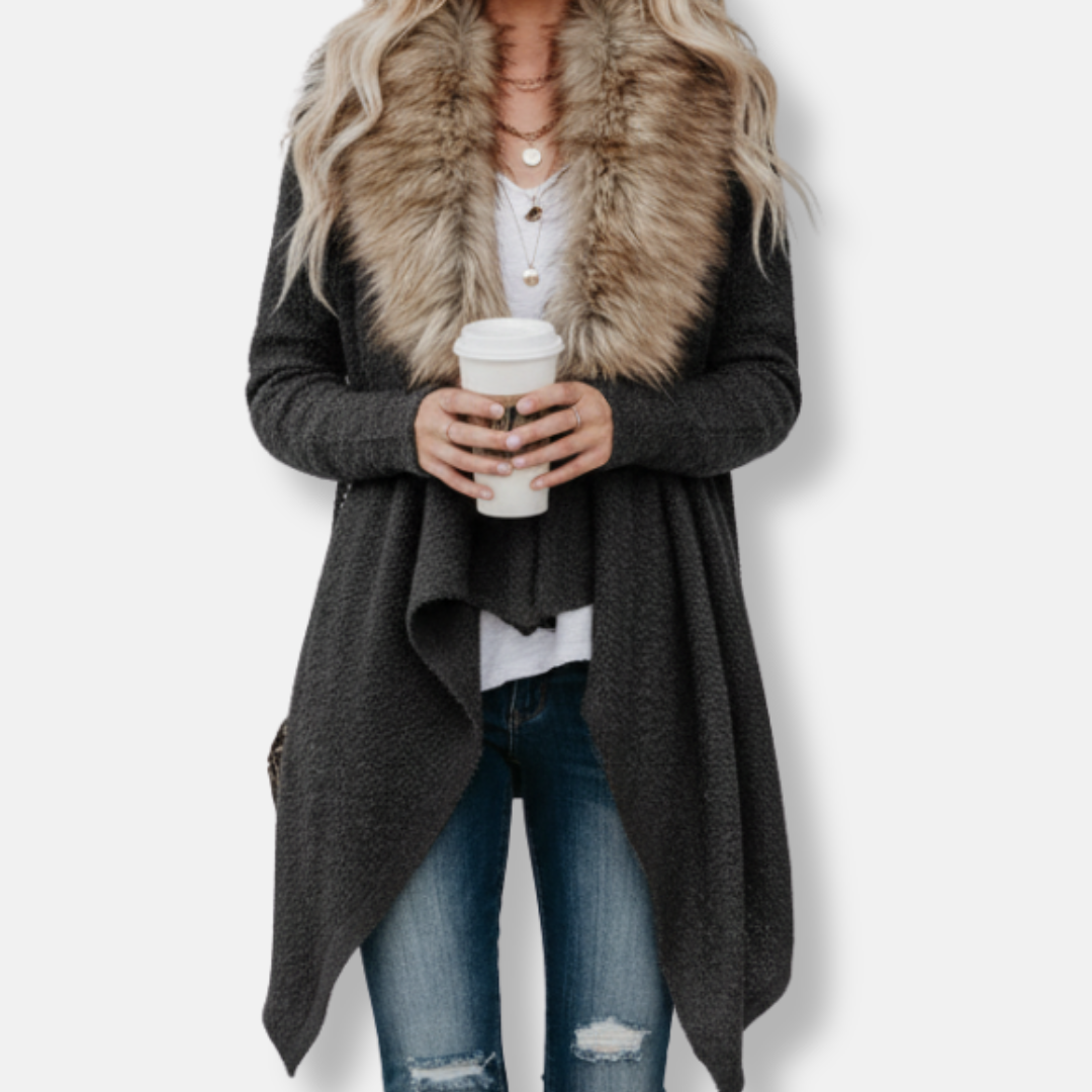 Women's Cardigan Coat – Loose Fit – Knitted Fabric – Faux Fur Collar – Open Front