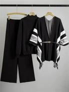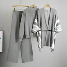- Design: Loose-fitting model, shawl collar, waist belt, wide sleeves, long length, with contrasting stripes along sleeves and trim.
