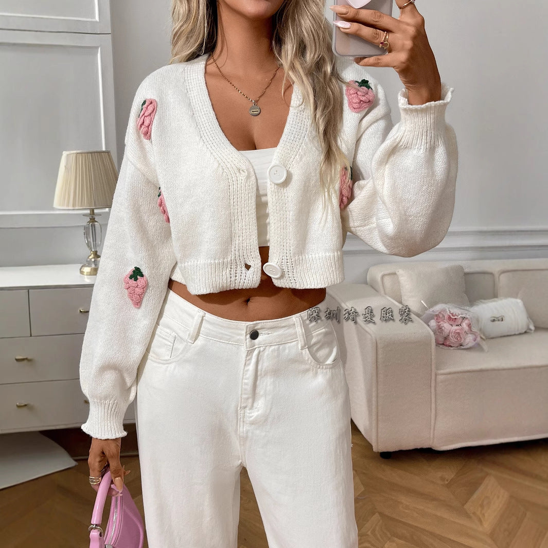 Women's Cardigan – Wool Blend – Cropped Fit – V-Neck – Button Closure – Embroidery