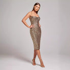 This shimmering midi dress with a zipper combines elegance with a modern flair. The subtle sheen of the fabric provides a refined look, while the zipper detail gives the dress a contemporary and functional twist. Perfect for both chic evenings and stylish events.
