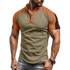 - Design: Slim fit, collarless, short sleeves, sporty contrasting panels, button closure