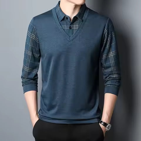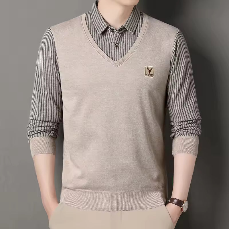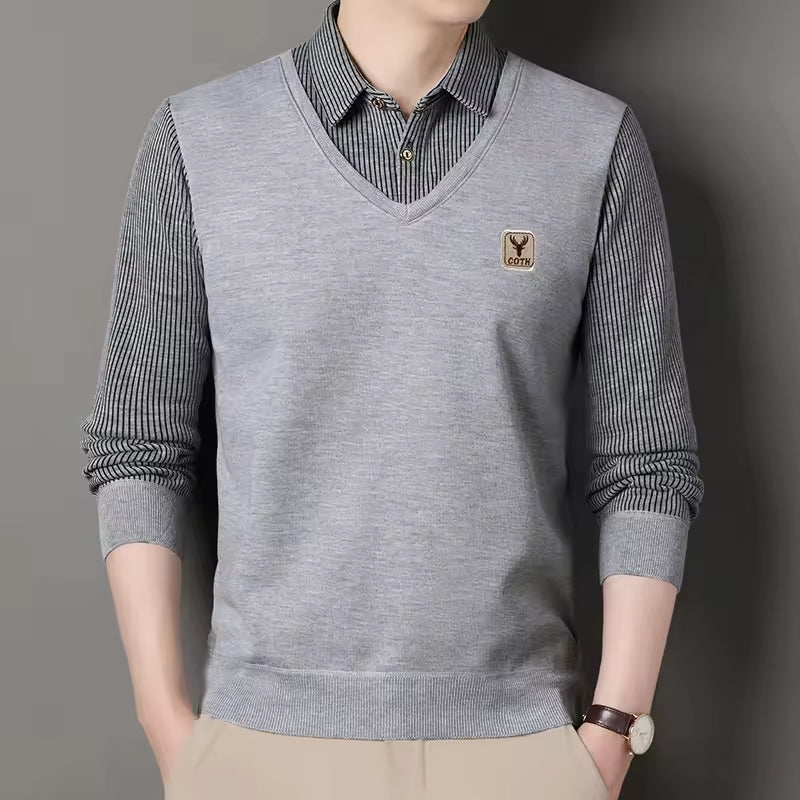 Men's sweater – Slim fit – Knitted – V-neck with layered look – Diamond sleeves