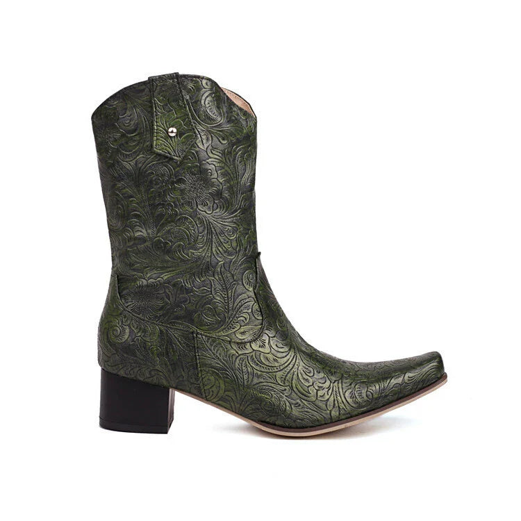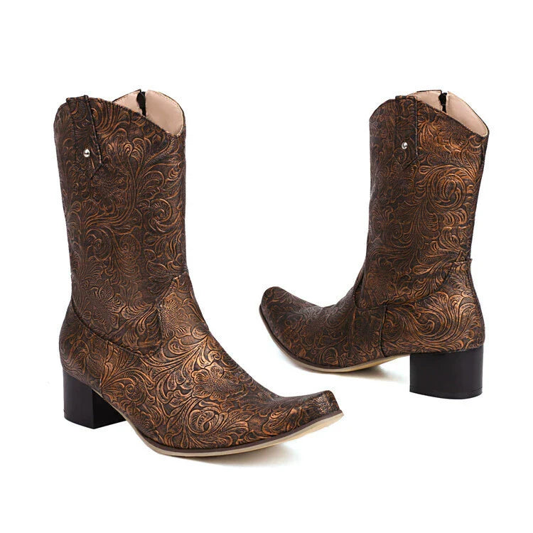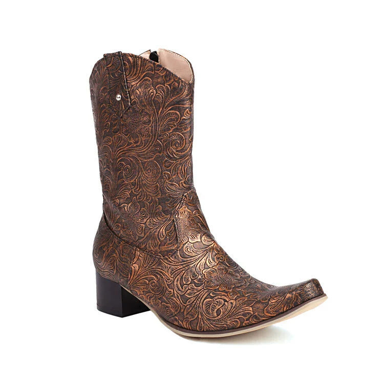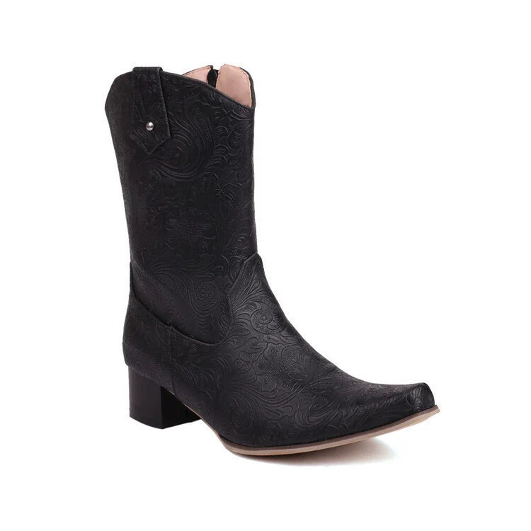 Unisex Boots – Mid-Height Shaft – Floral Embossing – Pointed Toe – Low Heel – Zipper