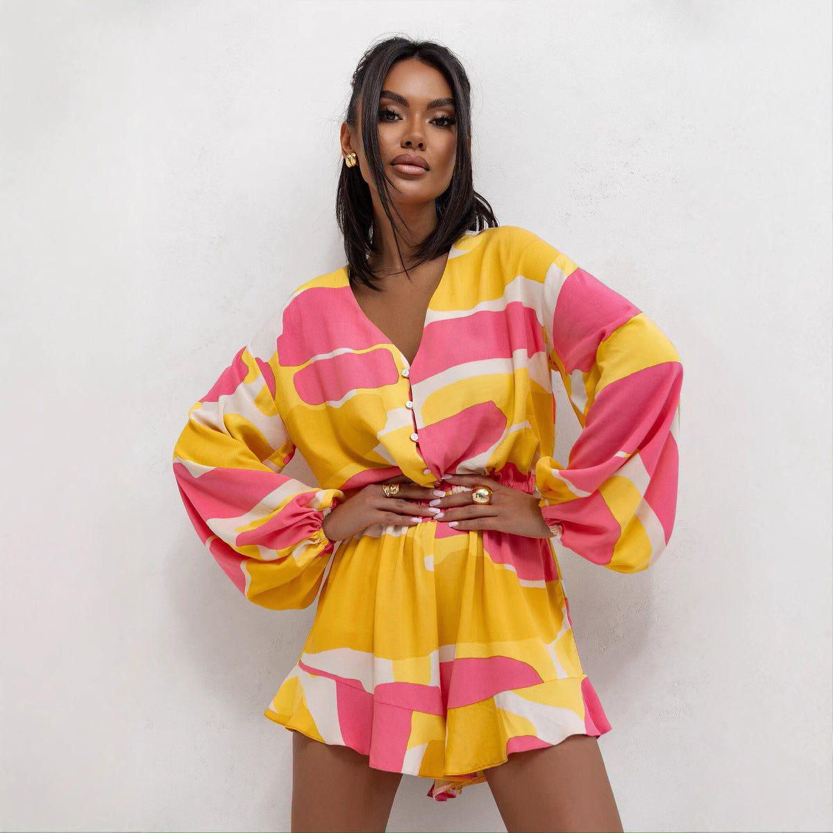 Women's Romper – Relaxed Fit – V-neck – Long Sleeves – Abstract Print – Fitted