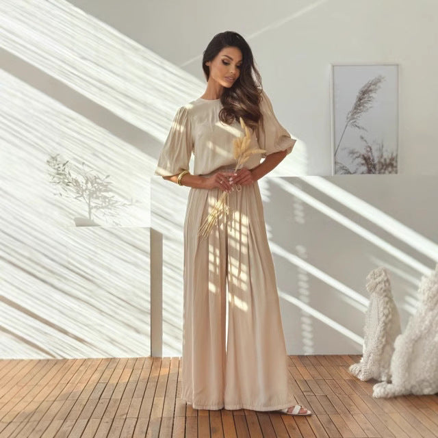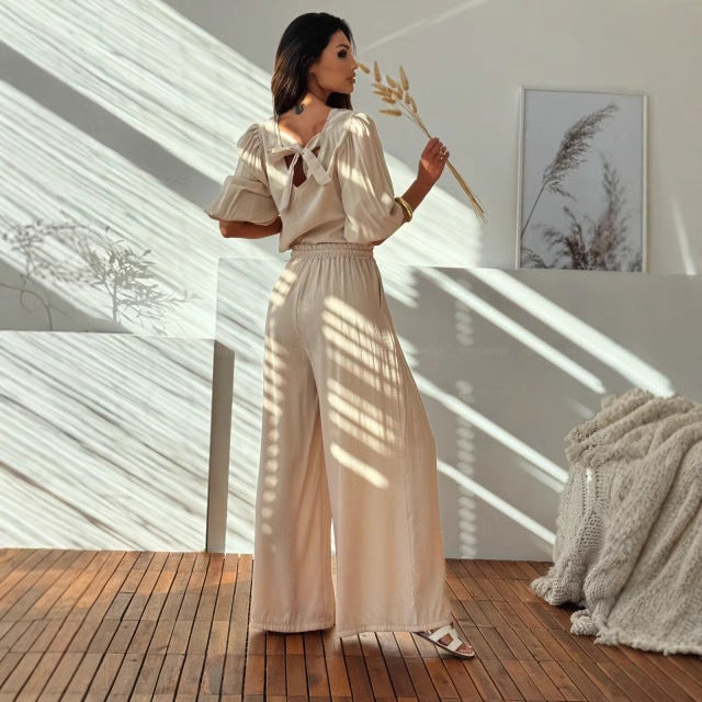 Women's Two-piece Set – Loose-fitting T-shirt with Bow – Wide Pants with Elastic Waist